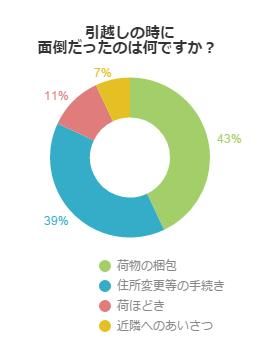 アンケートの結果、引越しで面倒だったのは荷物の梱包と回答した人に次いで、住所変更等の手続き、荷ほどき、近隣へのあいさつの順となりました。